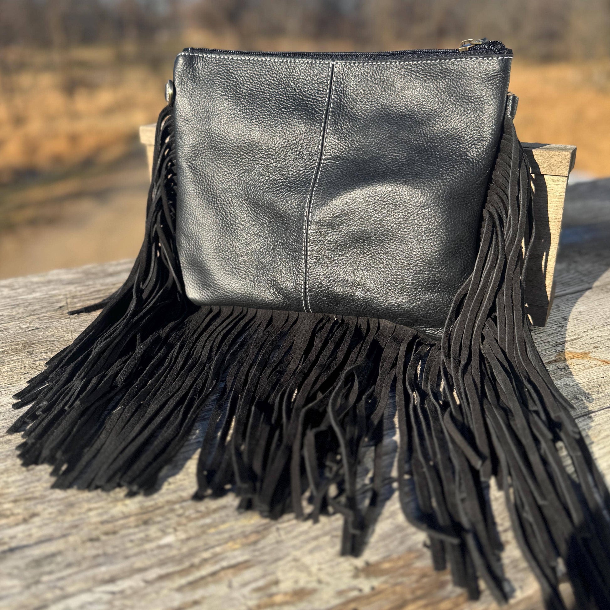 ALL LEATHER SALES ARE FINAL - NO RETURNS OR EXCHANGES ON LEATHER WILL BE ACCEPTED. Features: Genuine Leather, Cowhide and Tooled leather front, Smooth Leather back, fully lined with one inner zipper pocket, top zipper closure, 1.5" wide adjustable shoulder strap included, 10" fringe Purse Size 10"H x 11"W x 3"D Please note: Being a handmade product, each bag or wallet is unique in its own way and may be slightly different than the picture shown. Crafted with genuine leather, and tough stitching. Handmade by professional artisans, a beautifully made bag that will only get better with age.