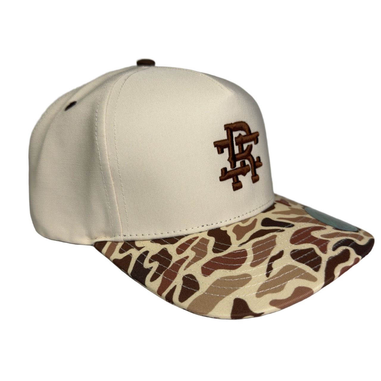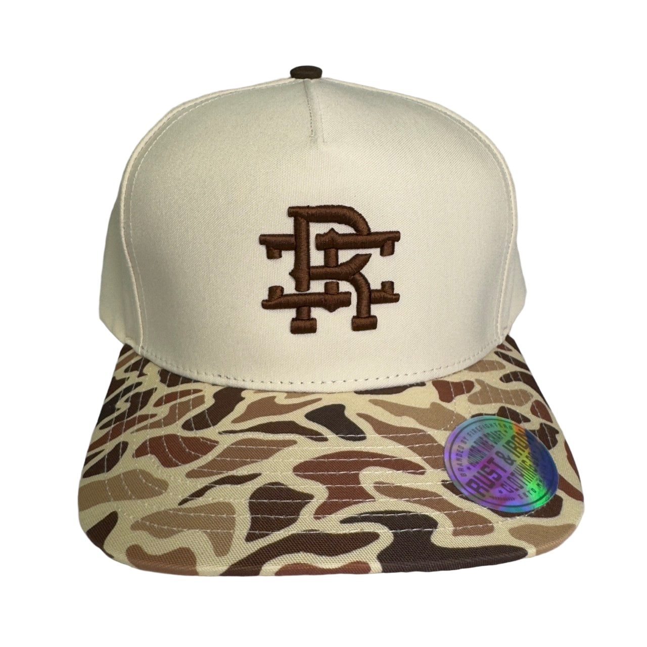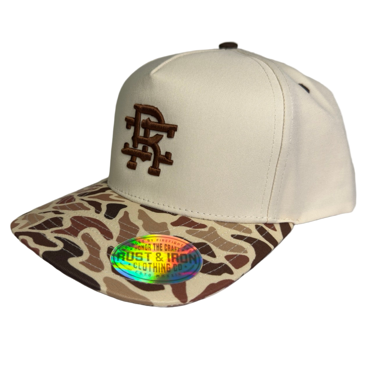 The Driftwood Hat combines a clean sand-colored crown with a vintage brush-camo bill — a nod to early-season hunts, late-season burns, and every mile of dirt in between. Embroidered with the Rust & Iron monogram in deep brown, this hat carries the grit of the fireline and the peace of the backwoods.