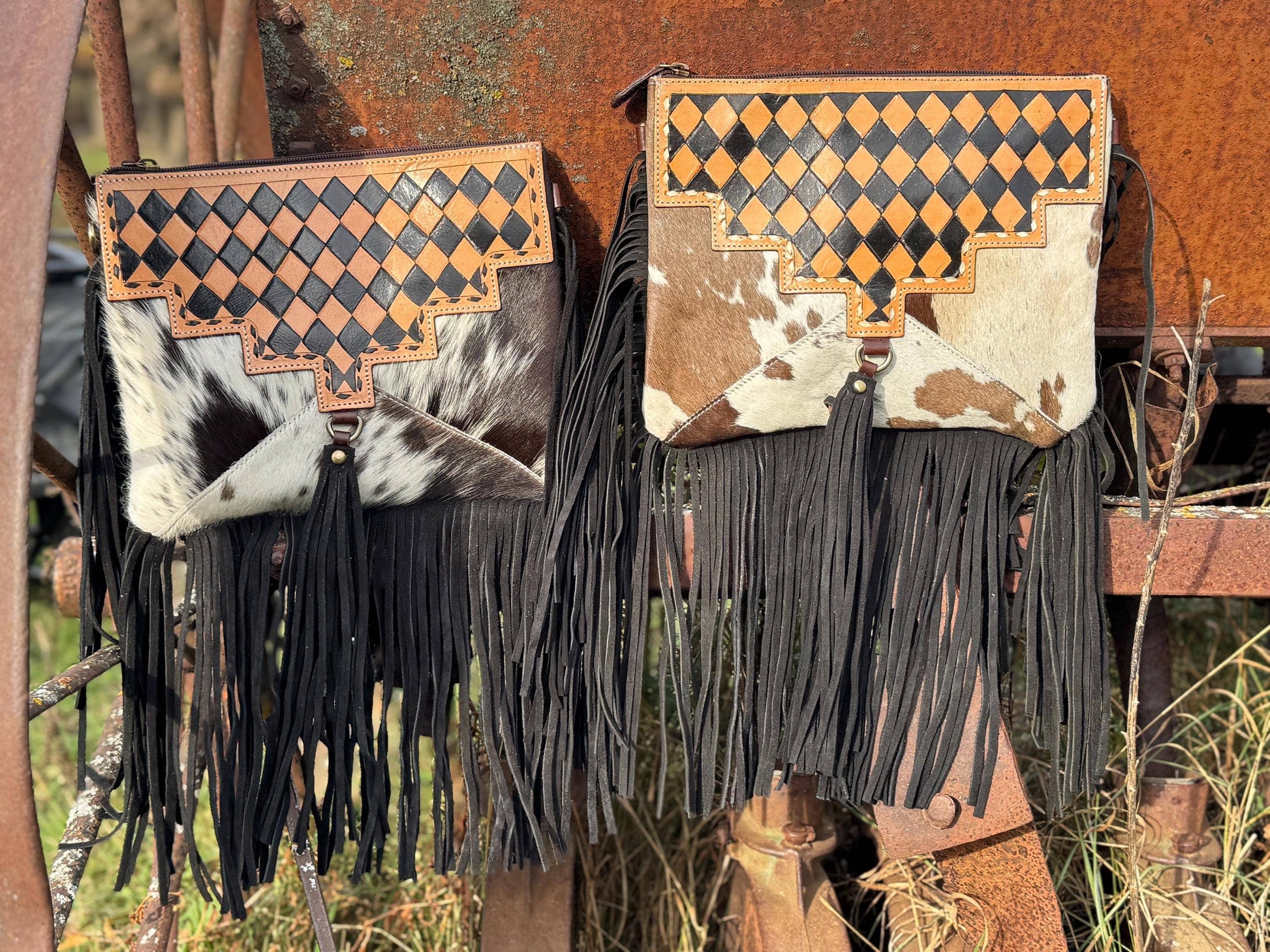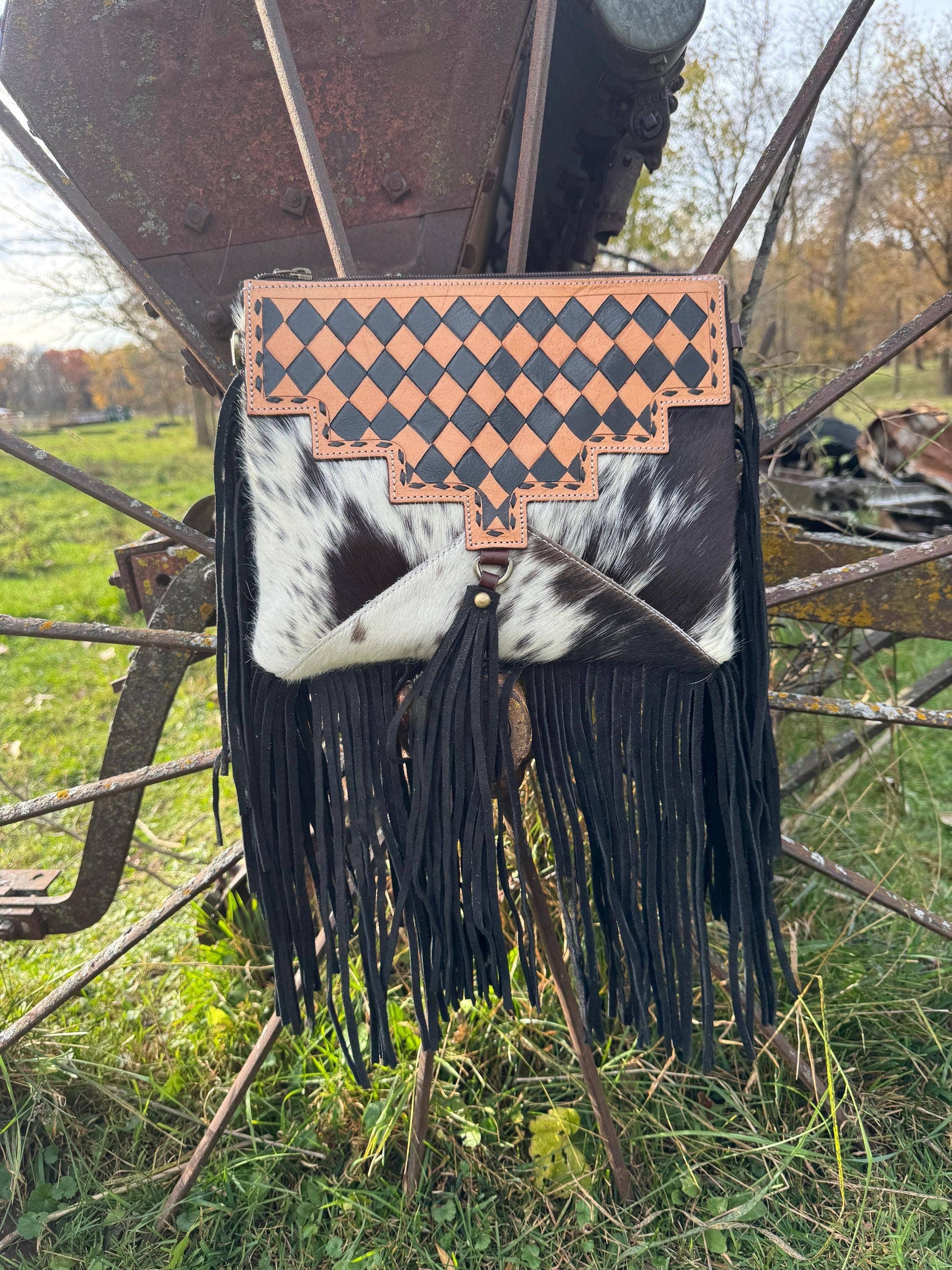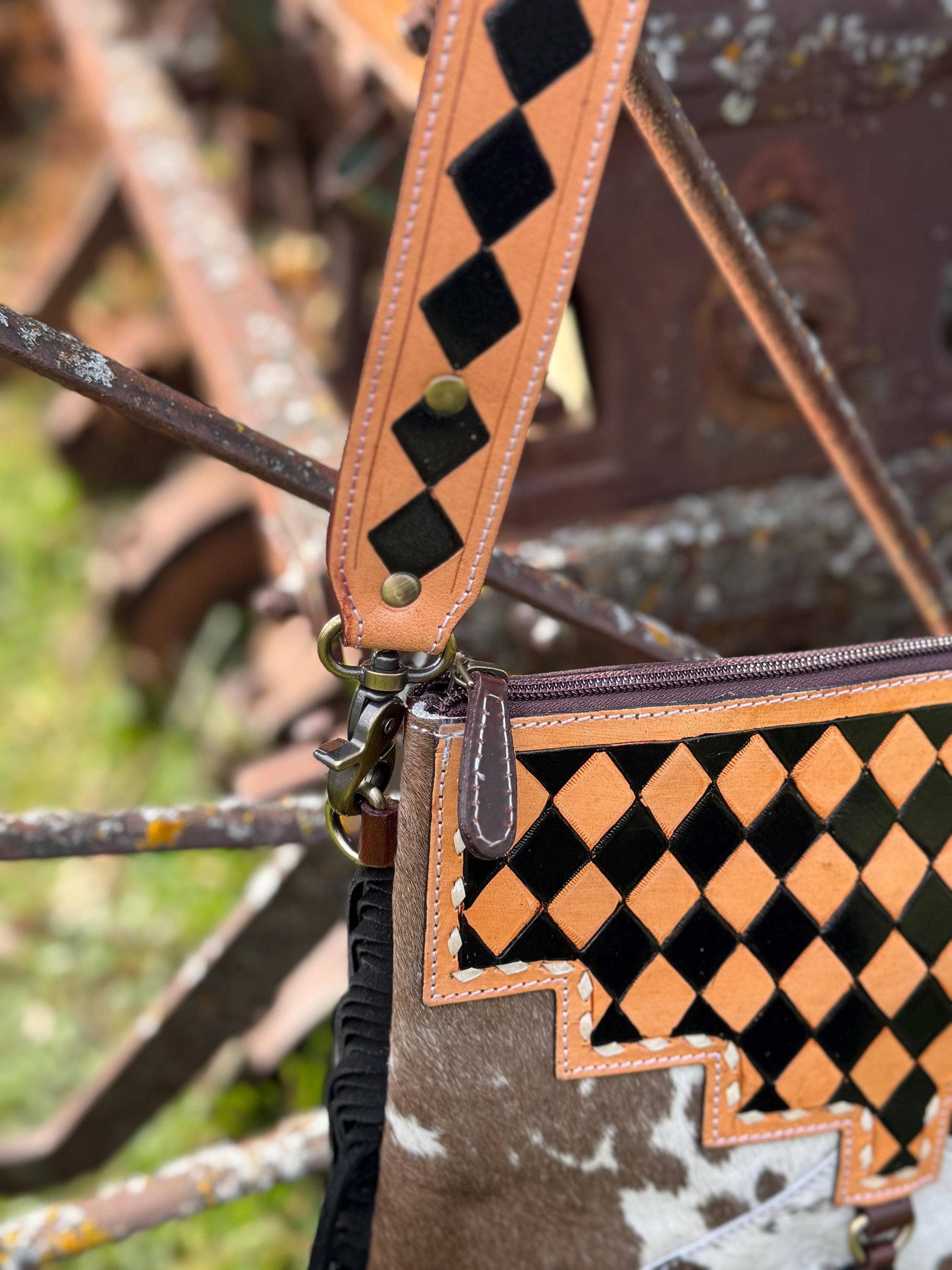 Western Tan Checkered Genuine Cowhide Leather Purse with fringe